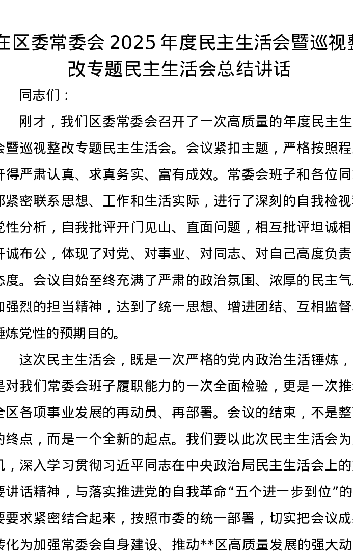在区委常委会2025年度xxxxx暨巡视整改专题xxxxx总结讲话