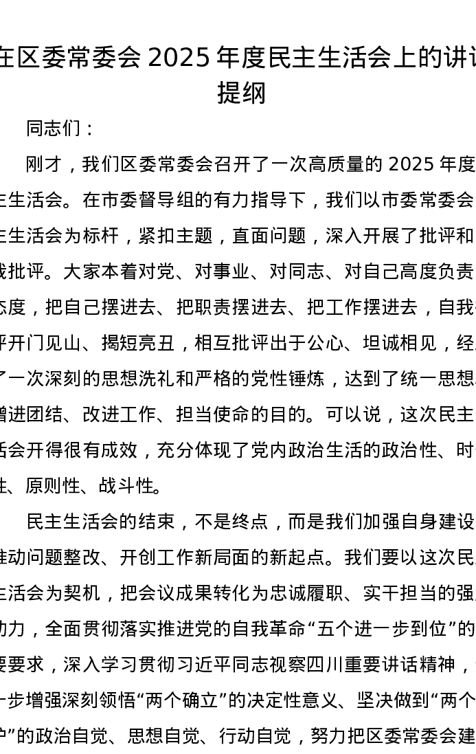 在区委常委会2025年度xxxxx上的讲话提纲