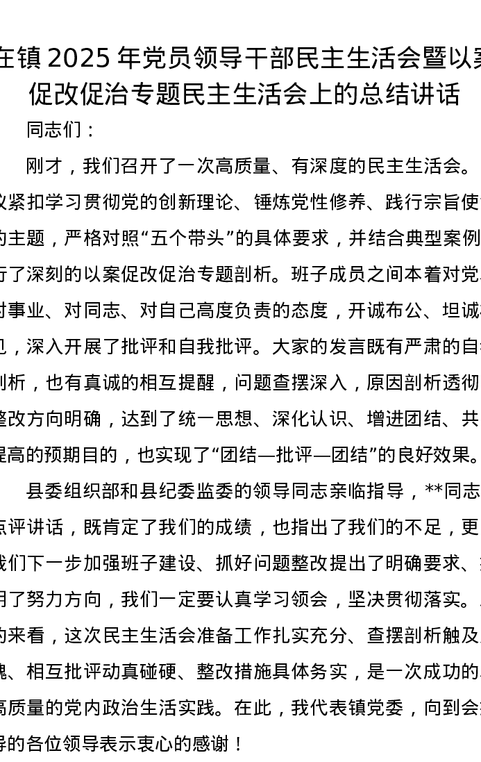 在镇2025年党员领导干部xxxxx暨以案促改促治专题xxxxx上的总结讲话