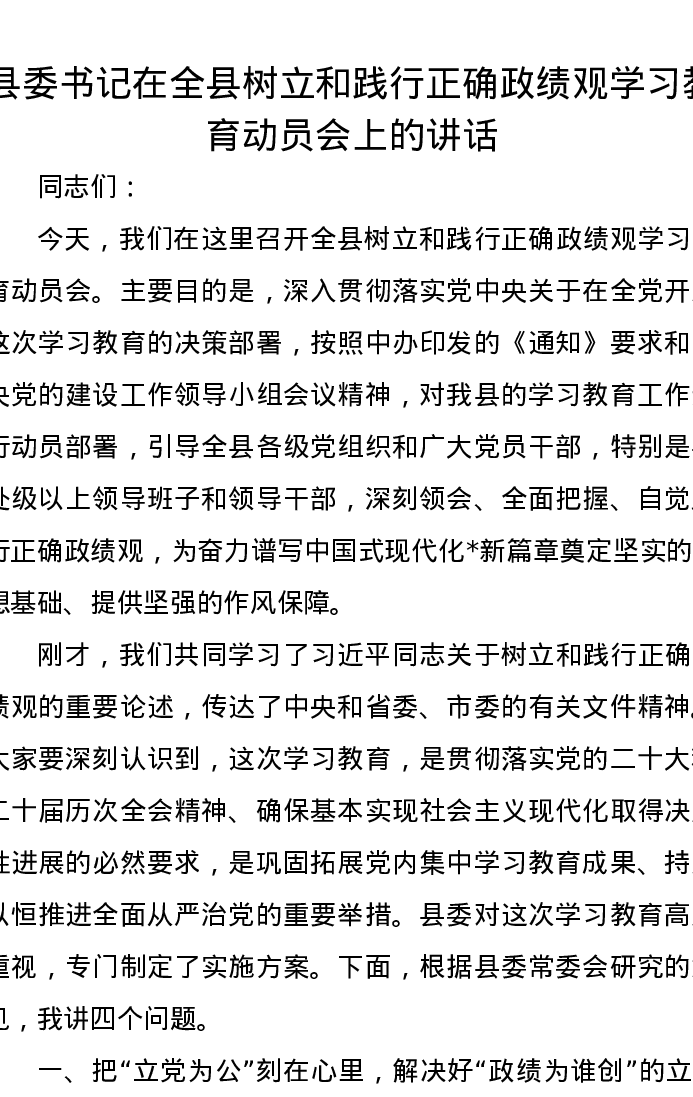 县委书记在全县树立和践行正确政绩观学习教育动员会上的讲话