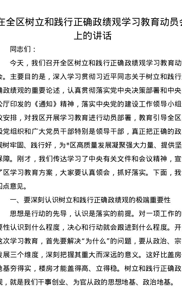 在全区树立和践行正确政绩观学习教育动员会上的讲话