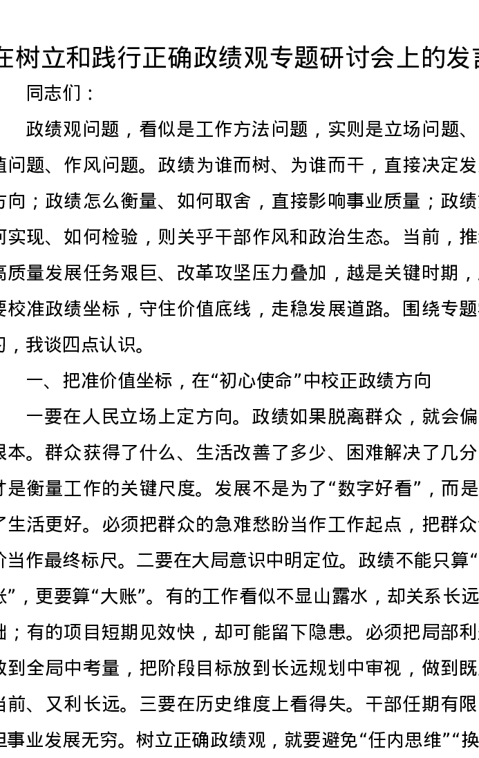 在树立和践行正确政绩观专题研讨会上的发言2