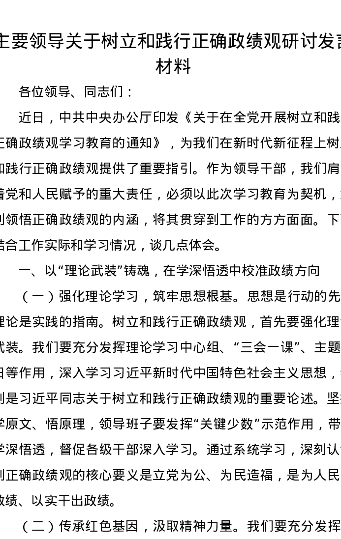 主要领导关于树立和践行正确政绩观研讨发言材料