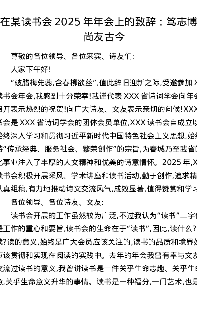 在某读书会2025年年会上的致辞:笃志博学尚友古今