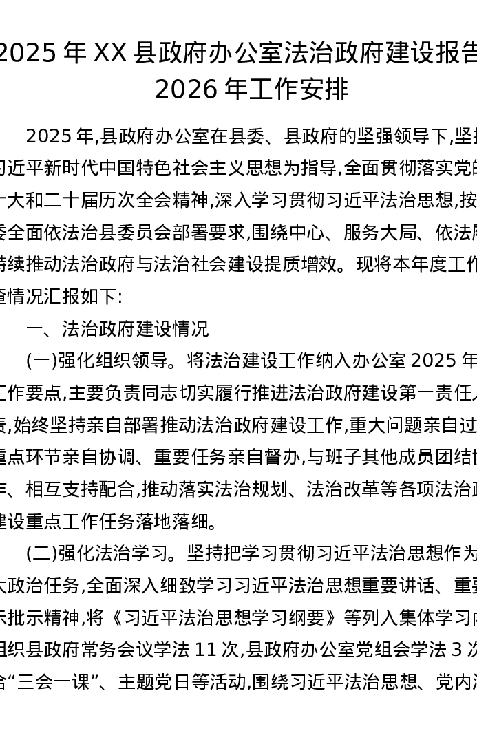 2025年XX县政府办公室法治政府建设报告及2026年工作安排