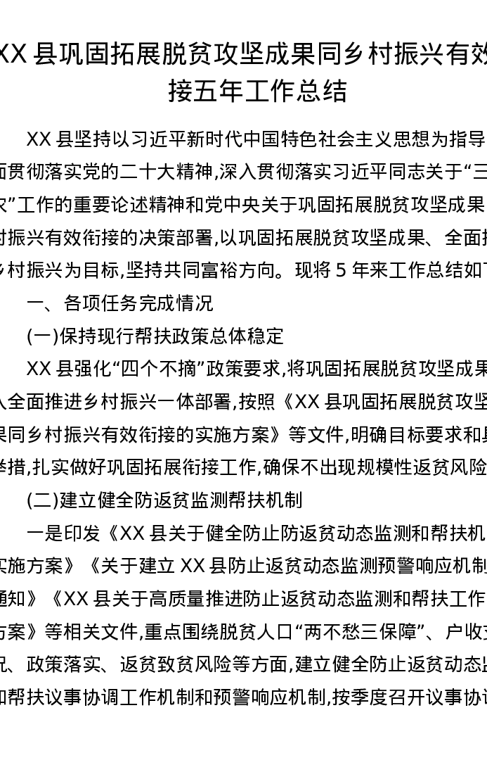 XX县巩固拓展脱贫攻坚成果同乡村振兴有效衔接五年工作总结