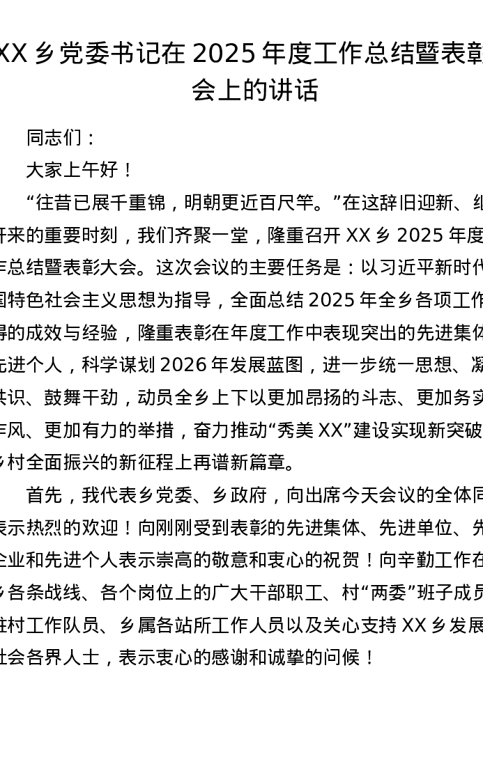 XX乡党委书记在2025年度工作总结暨表彰大会上的讲话(12855字)