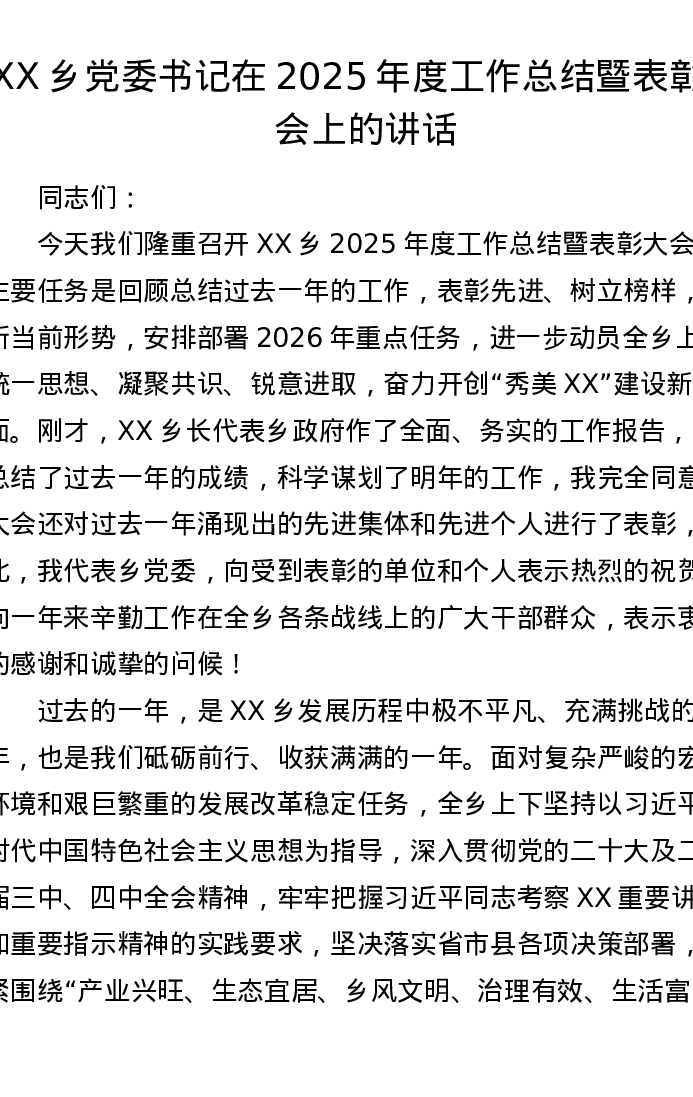 XX乡党委书记在2025年度工作总结暨表彰大会上的讲话