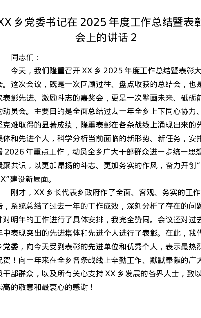 XX乡党委书记在2025年度工作总结暨表彰大会上的讲话2