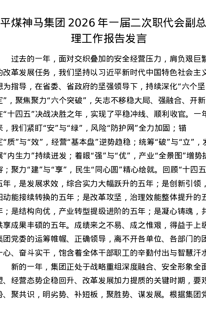 平煤神马集团2026年一届二次职代会副总经理工作报告发言