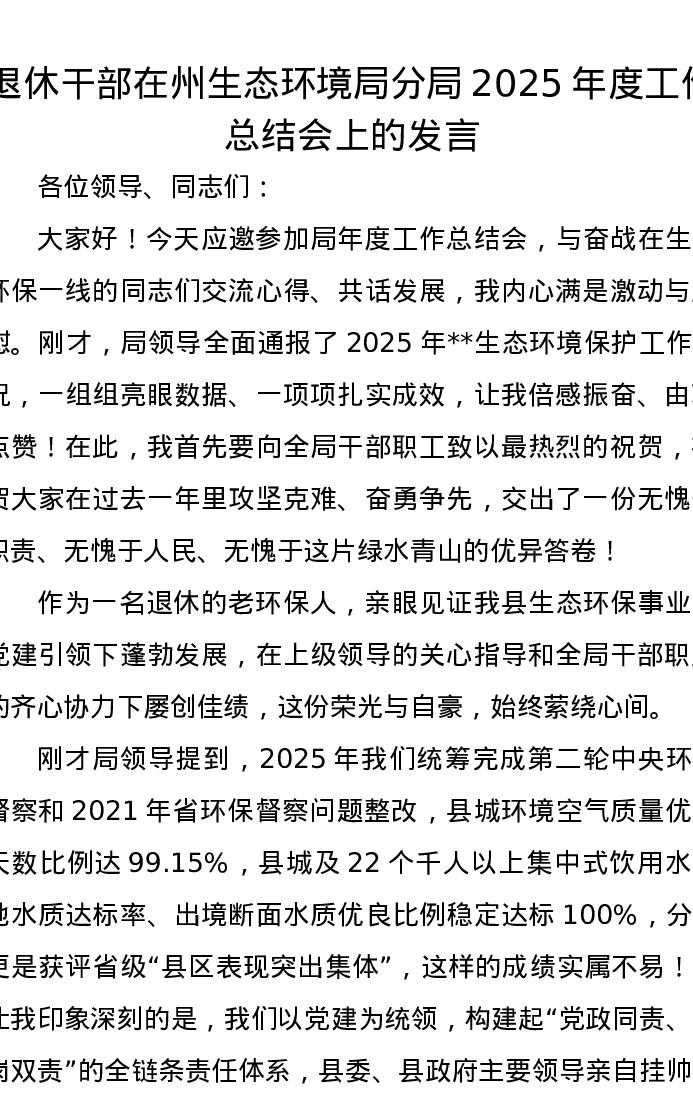 退休干部在州生态环境局分局2025年度工作总结会上的发言