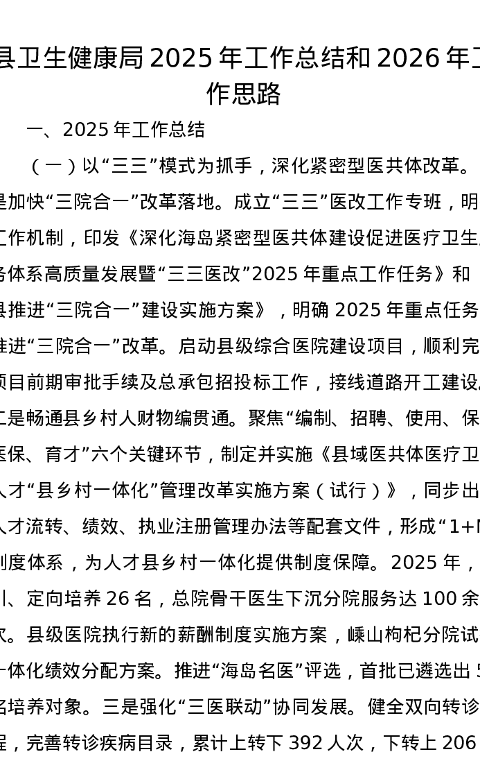县卫生健康局2025年工作总结和2026年工作思路