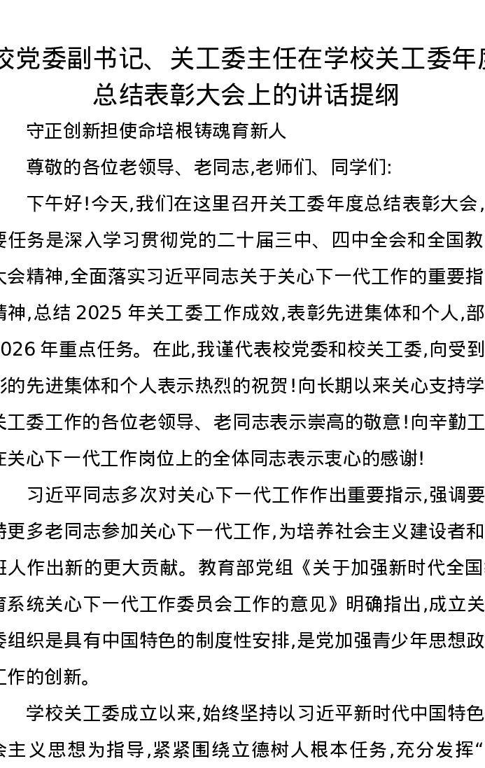 校党委副书记、关工委主任在学校关工委年度总结表彰大会上的讲话提纲