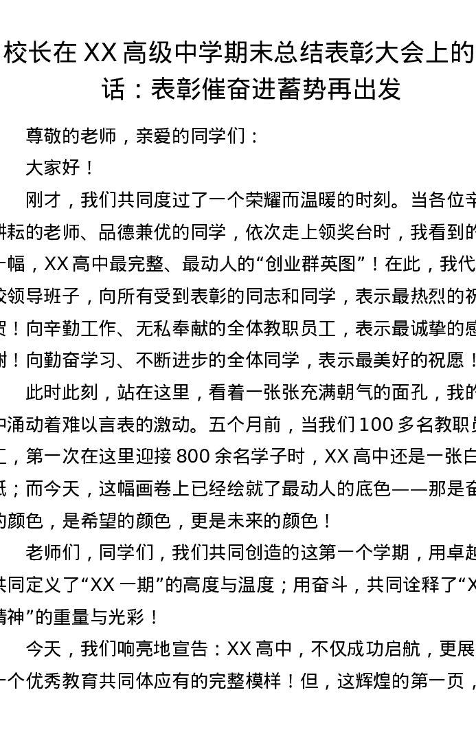 校长在XX高级中学期末总结表彰大会上的讲话:表彰催奋进蓄势再出发