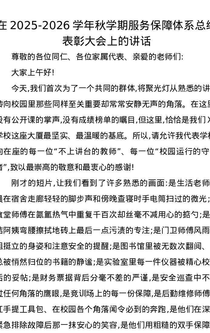 在2025-2026学年秋学期服务保障体系总结表彰大会上的讲话