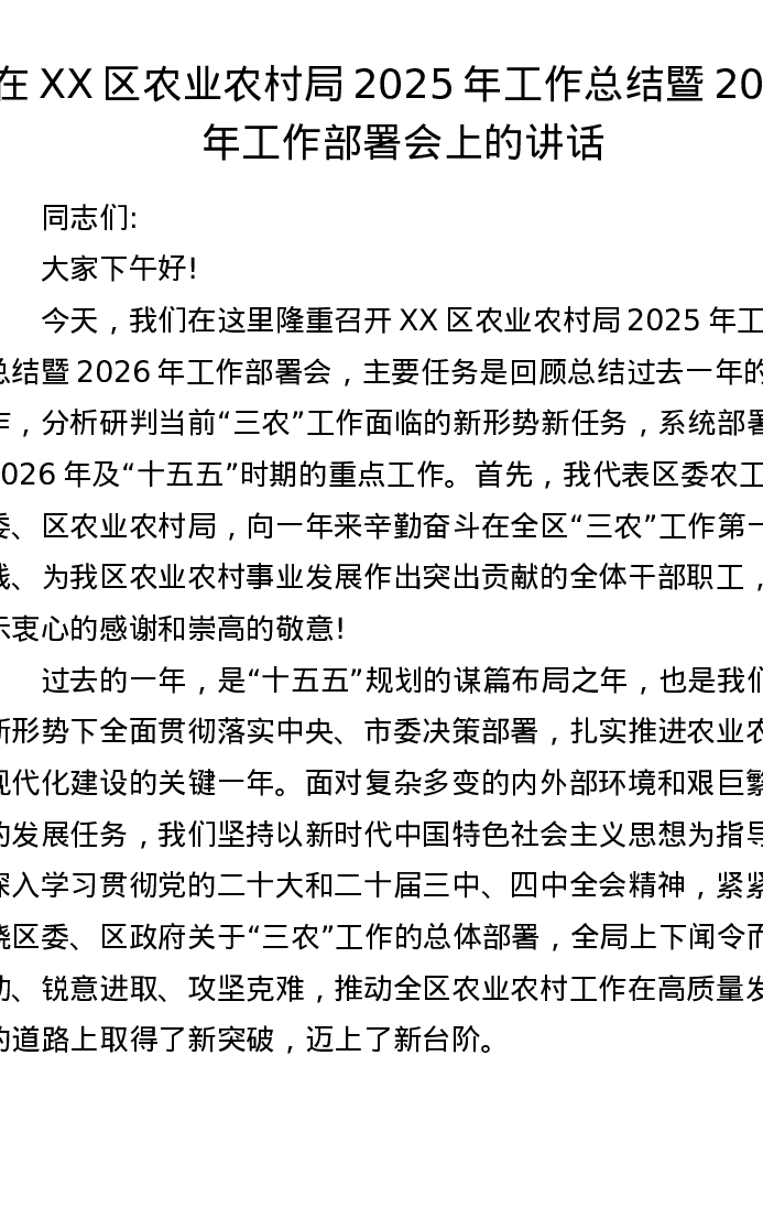 在XX区农业农村局2025年工作总结暨2026年工作部署会上的讲话