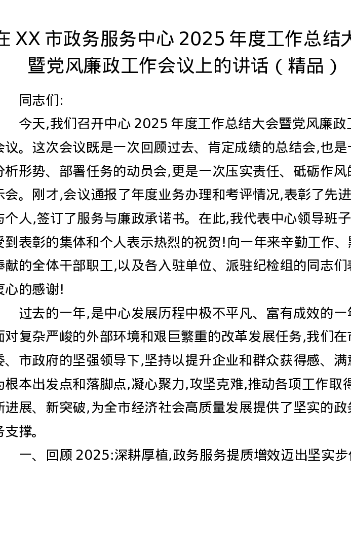 在XX市政务服务中心2025年度工作总结大会暨党风廉政工作会议上的讲话
