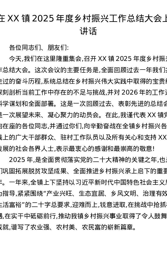在XX镇2025年度乡村振兴工作总结大会上的讲话