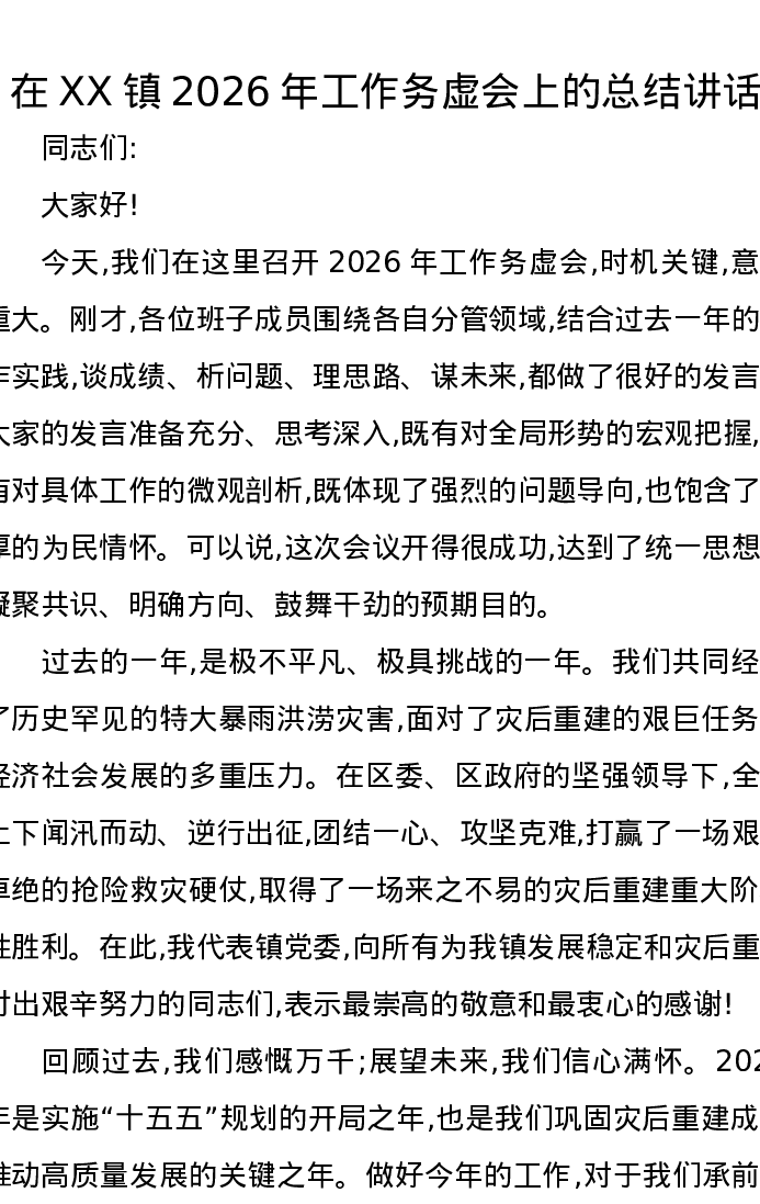 在XX镇2026年工作务虚会上的总结讲话(4)