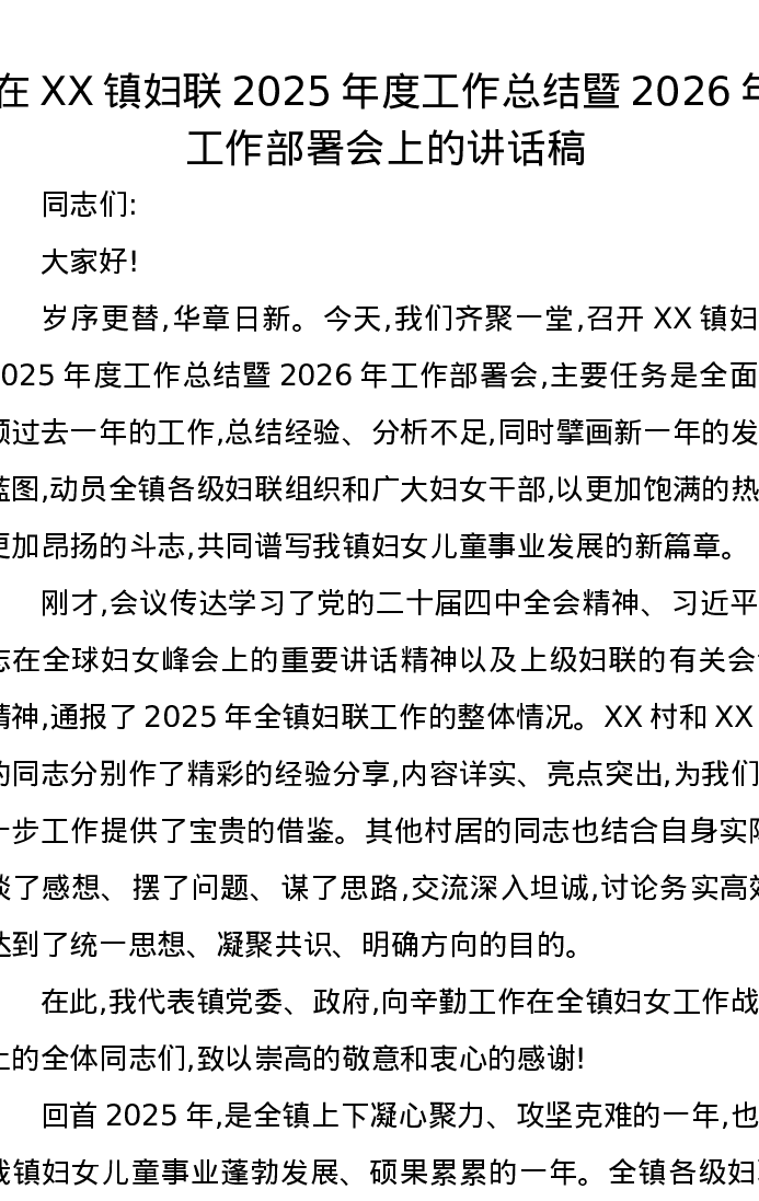 在XX镇妇联2025年度工作总结暨2026年工作部署会上的讲话稿