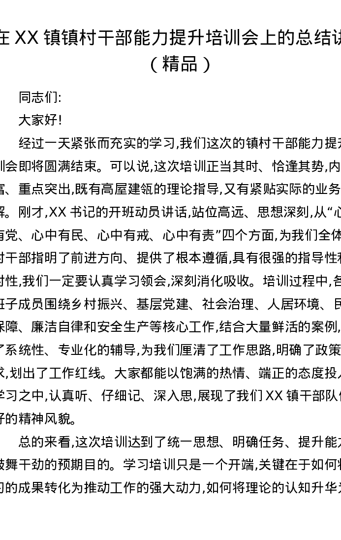 在XX镇镇村干部能力提升培训会上的总结讲话