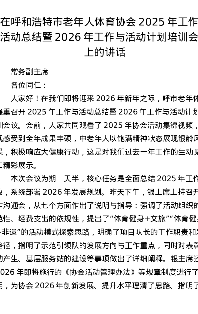在呼和浩特市老年人体育协会2025年工作与活动总结暨2026年工作与活动计划培训会议