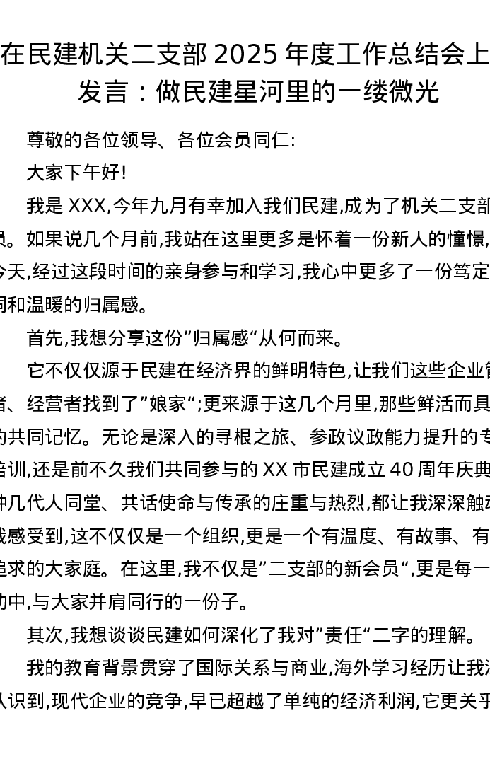 在民建机关二支部2025年度工作总结会上的发言 :做民建星河里的一缕微光