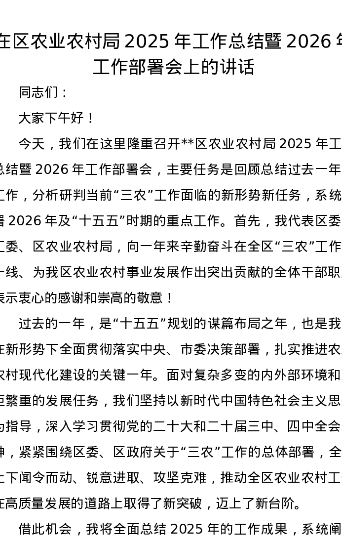 在区农业农村局2025年工作总结暨2026年工作部署会上的讲话