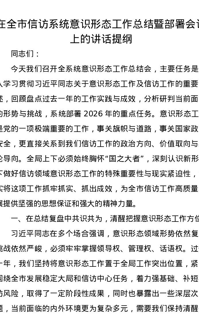 在全市信访系统意识形态工作总结暨部署会议上的讲话提纲