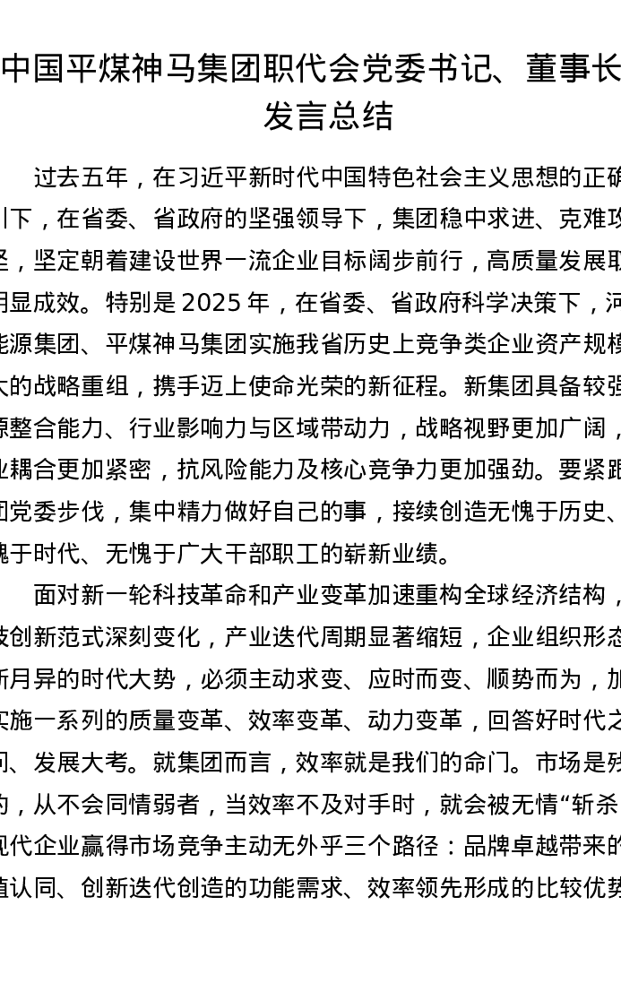 中国平煤神马集团职代会党委书记、董事长的发言总结