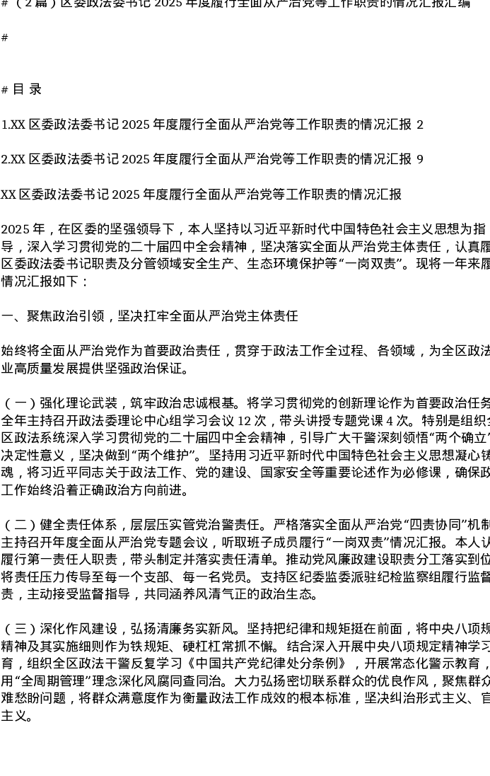 汇编:区委政法委书记2025年度履行全面从严治党等工作职责的情况汇报2篇