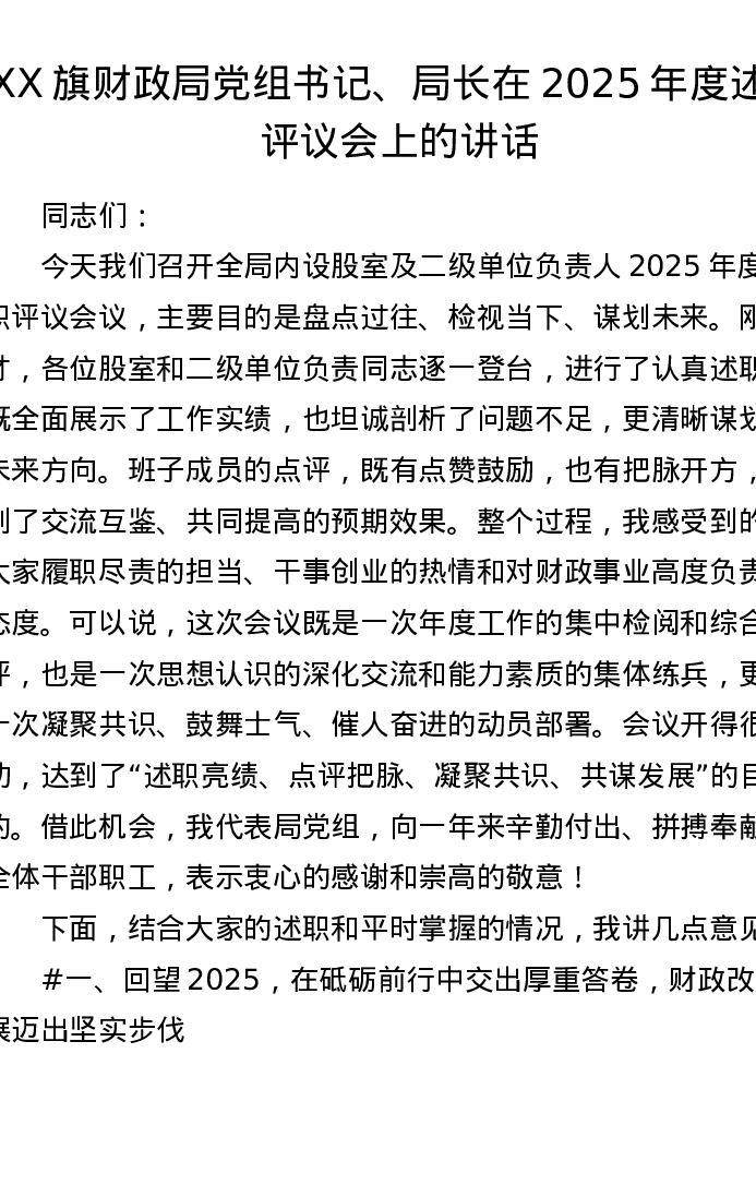 XX旗财政局党组书记、局长在2025年度述职评议会上的讲话(5540字)