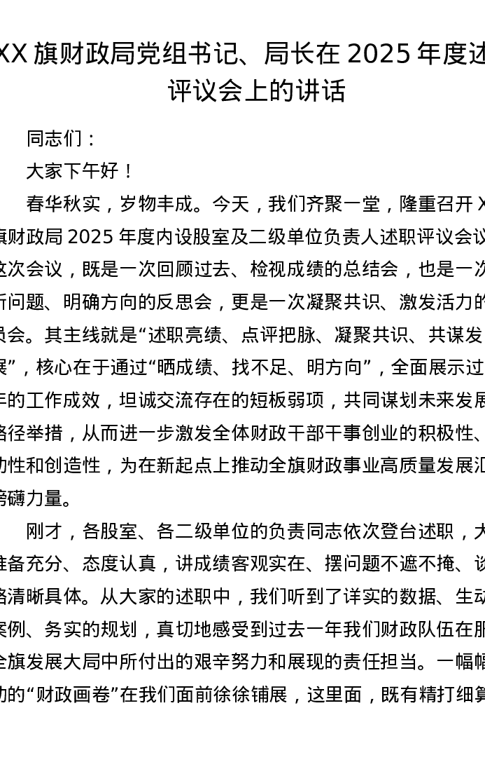 XX旗财政局党组书记、局长在2025年度述职评议会上的讲话