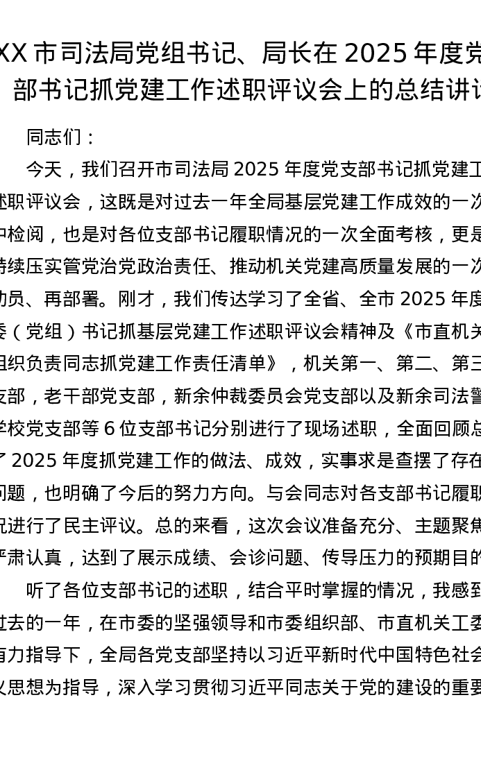 XX市司法局党组书记、局长在2025年度党支部书记抓党建工作述职评议会上的总结讲话