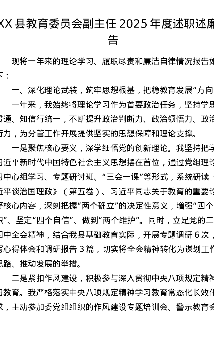 XX县教育委员会副主任2025年度述职述廉报告