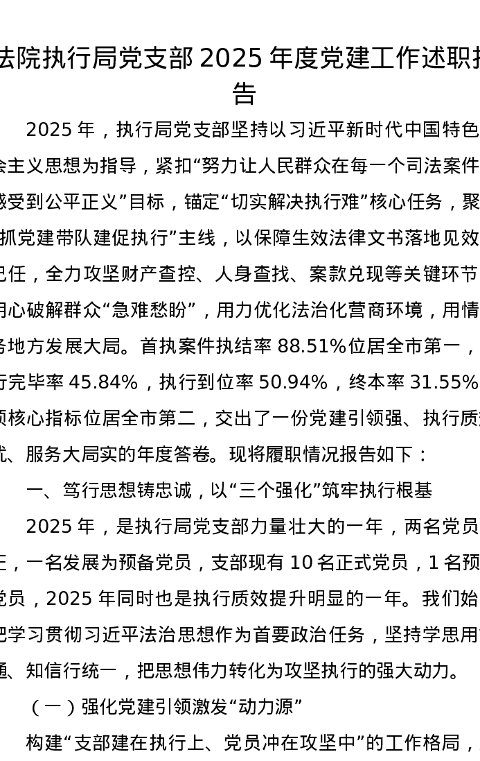 法院执行局党支部2025年度党建工作述职报告