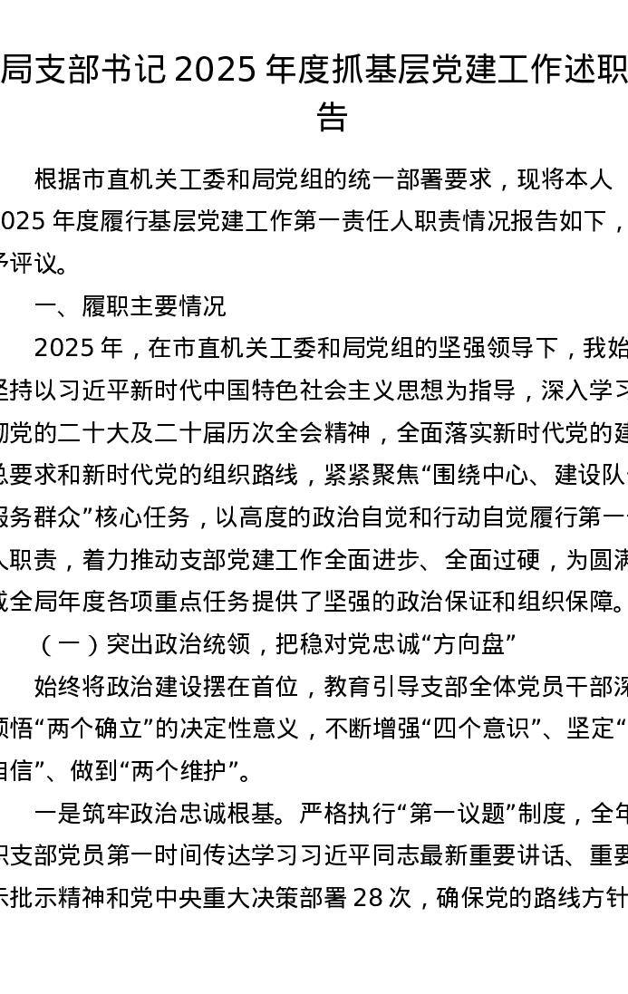 局支部书记2025年度抓基层党建工作述职报告
