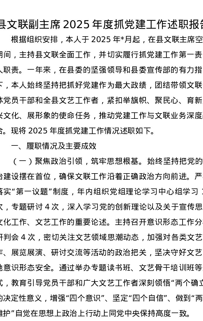 县文联副主席2025年度抓党建工作述职报告