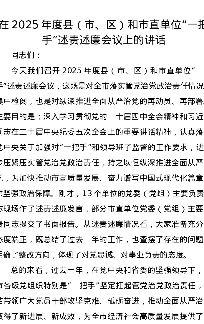 在2025年度县(市、区)和市直单位一把手述责述廉会议上的讲话