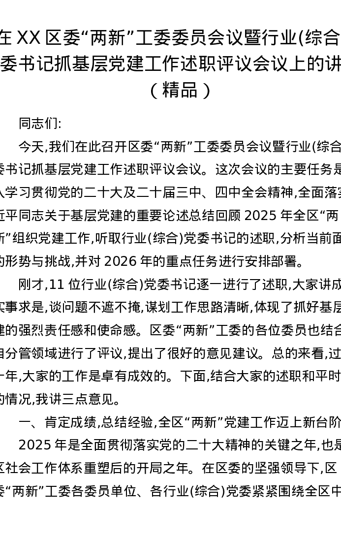 在XX区委两新工委委员会议暨行业(综合)党委书记抓基层党建工作述职评议会议上的讲话