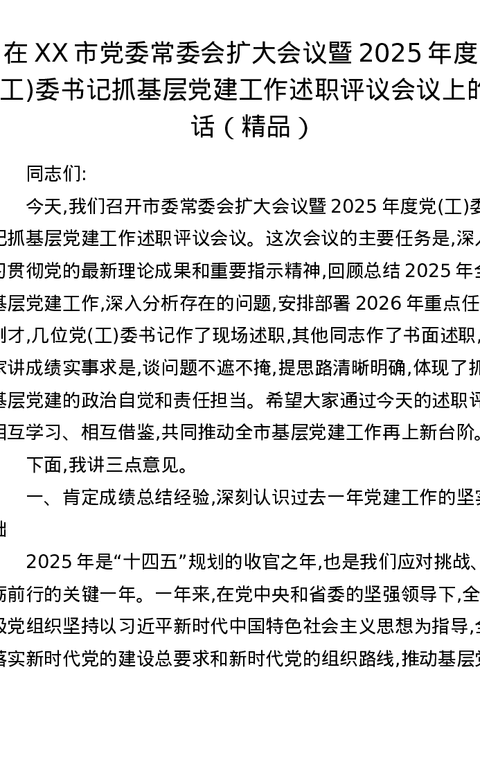 在XX市党委常委会扩大会议暨2025年度党(工)委书记抓基层党建工作述职评议会议上的讲话