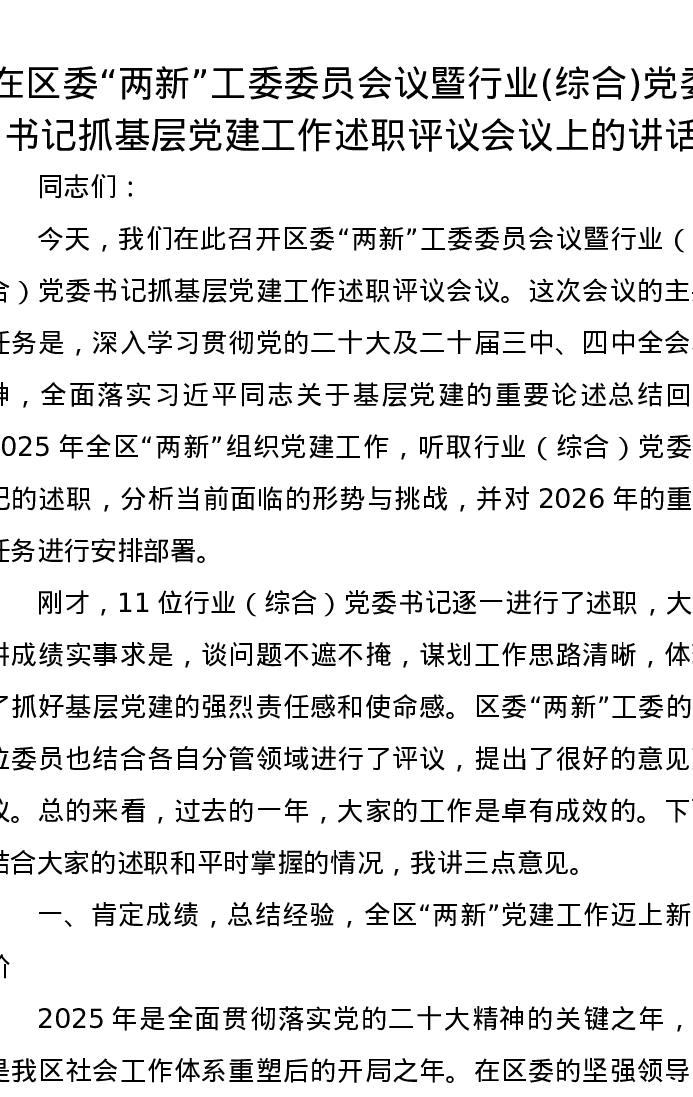 在区委两新工委委员会议暨行业(综合)党委书记抓基层党建工作述职评议会议上的讲话