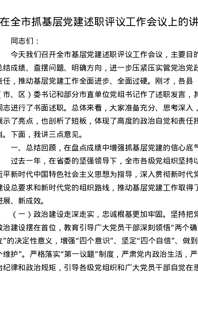 在全市抓基层党建述职评议工作会议上的讲话