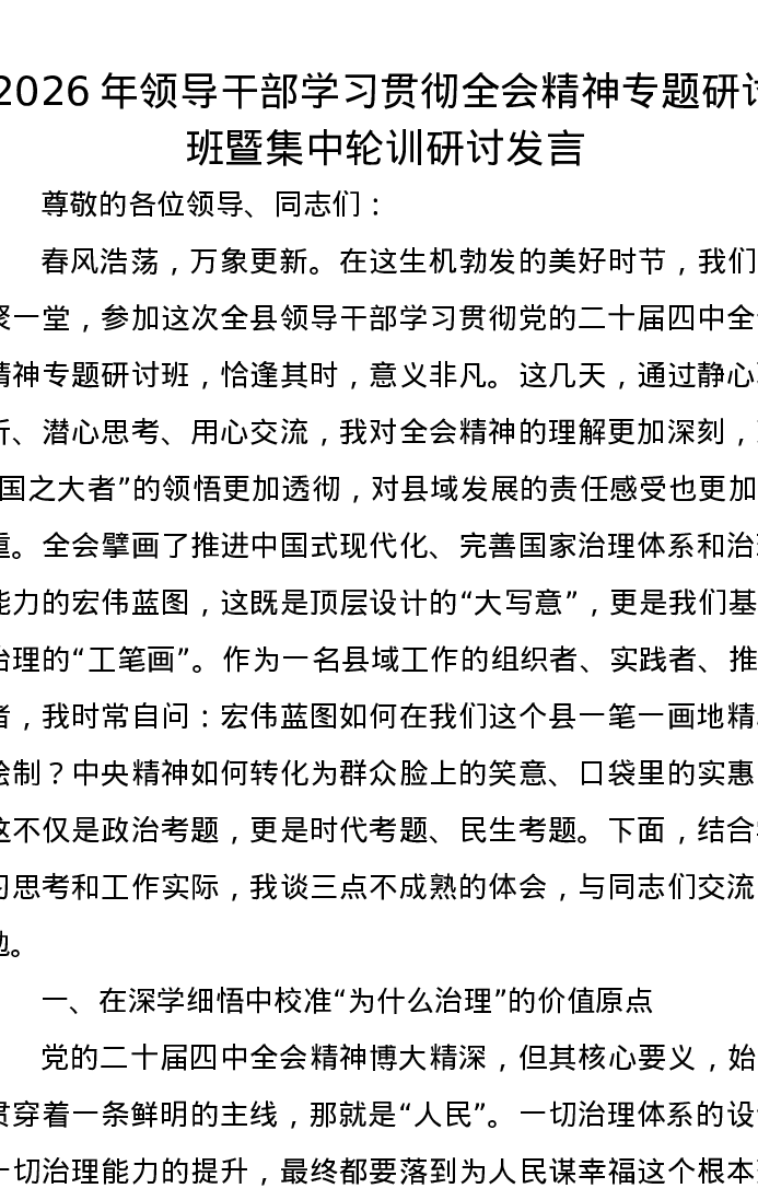 2026年领导干部学习贯彻全会精神专题研讨班暨集中轮训研讨发言