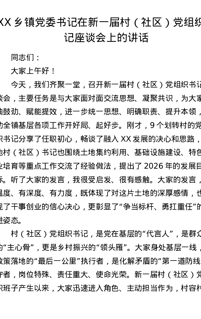 XX乡镇党委书记在新一届村(社区)党组织书记座谈会上的讲话(5546字)