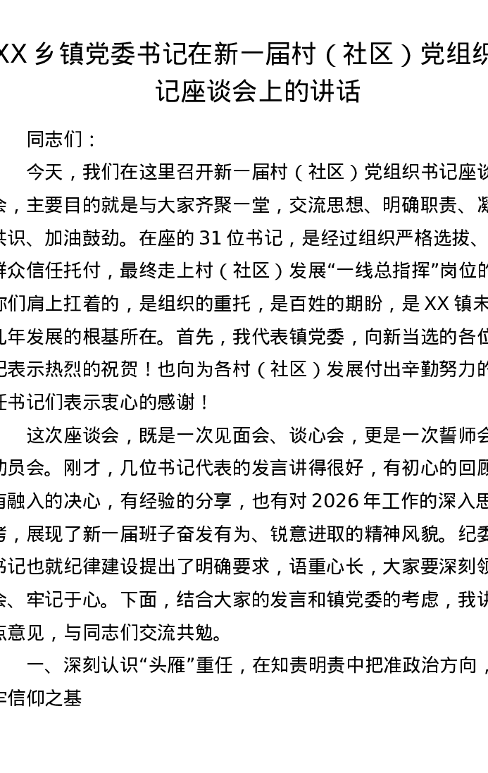 XX乡镇党委书记在新一届村(社区)党组织书记座谈会上的讲话