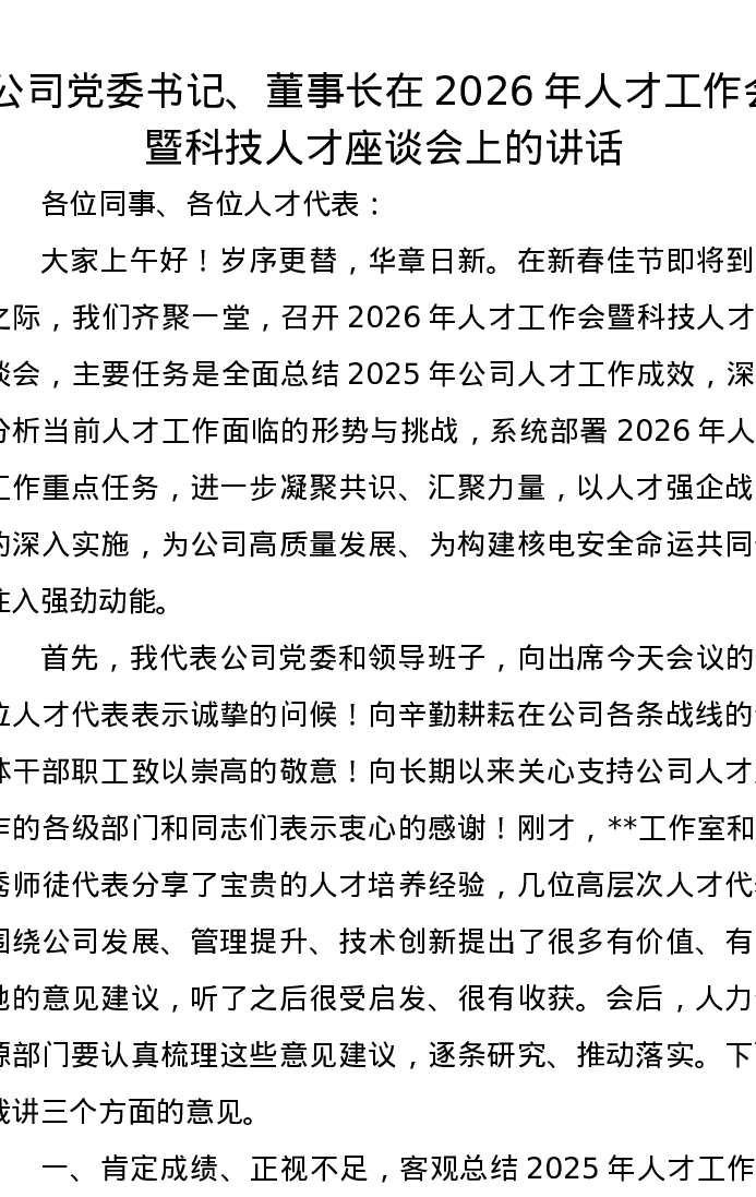公司党委书记、董事长在2026年人才工作会暨科技人才座谈会上的讲话