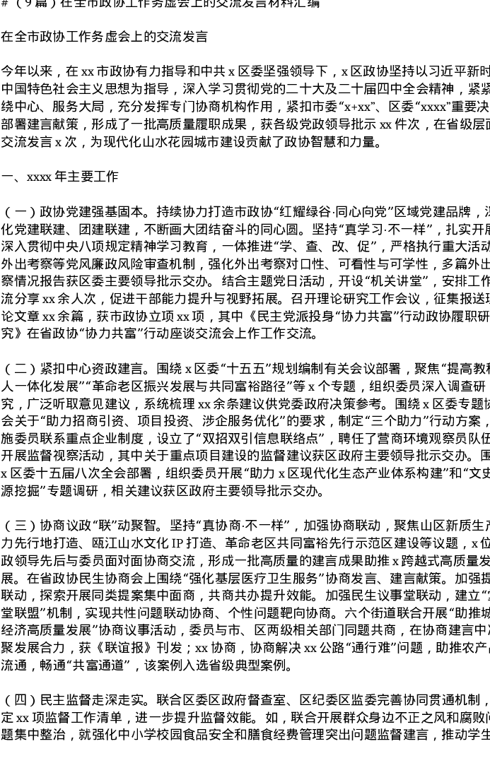 汇编:在全市政协工作务虚会上的交流发言材9篇