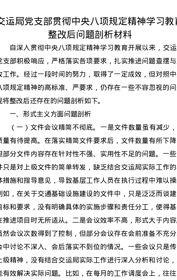 交运局党支部贯彻中央八项规定精神学习教育整改后问题剖析发言材料
