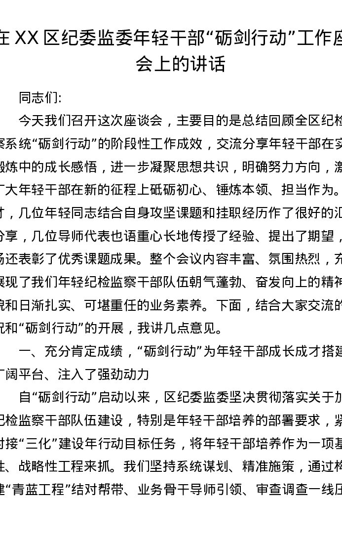 在XX区纪委监委年轻干部砺剑行动工作座谈会上的讲话
